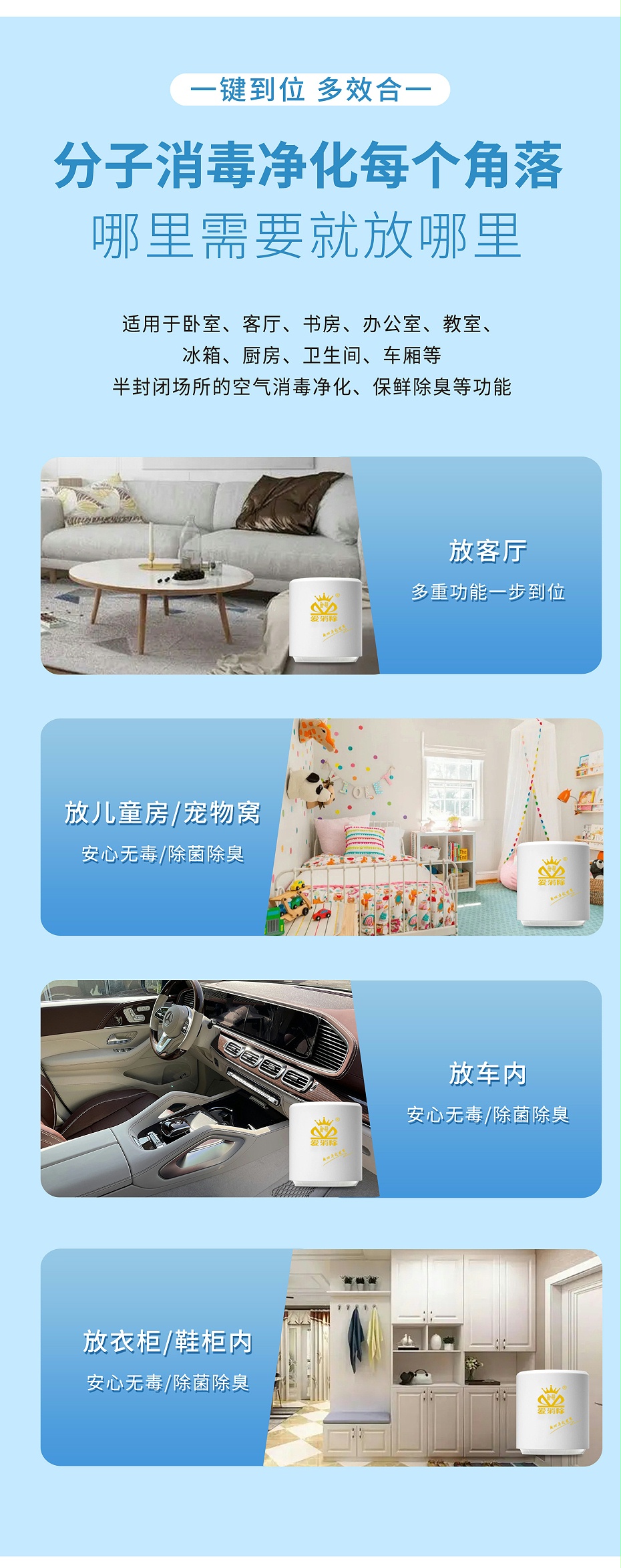 客厅、书房、卧室、鞋柜、厨房、卫生间、冰箱、汽车、保鲜库等半封闭空间。可有效去除甲醛、烟味、鞋臭等异味;并能有效地杀菌消毒,可有效阻止流感、新冠的传播。
